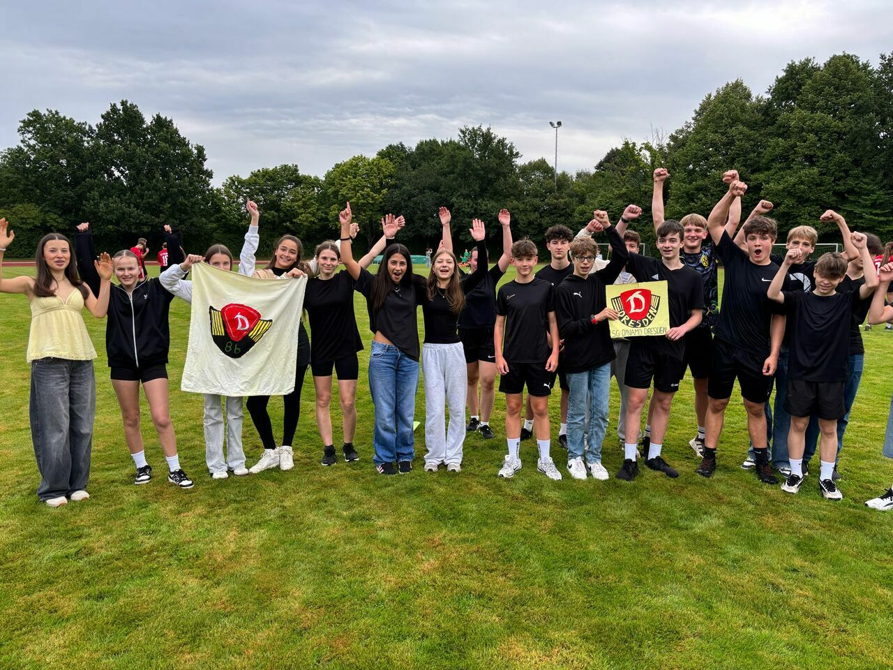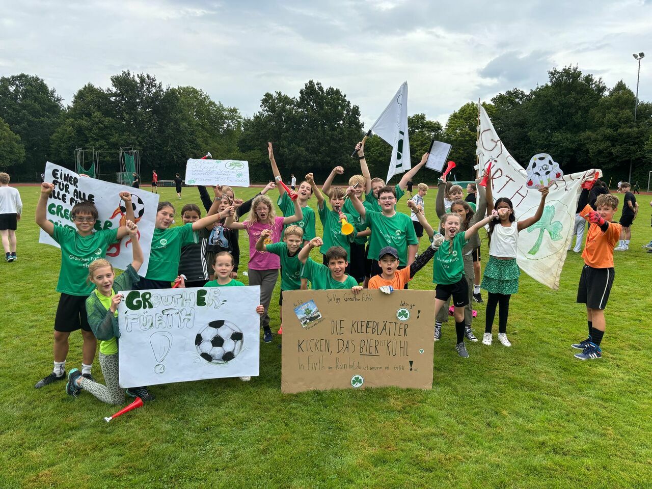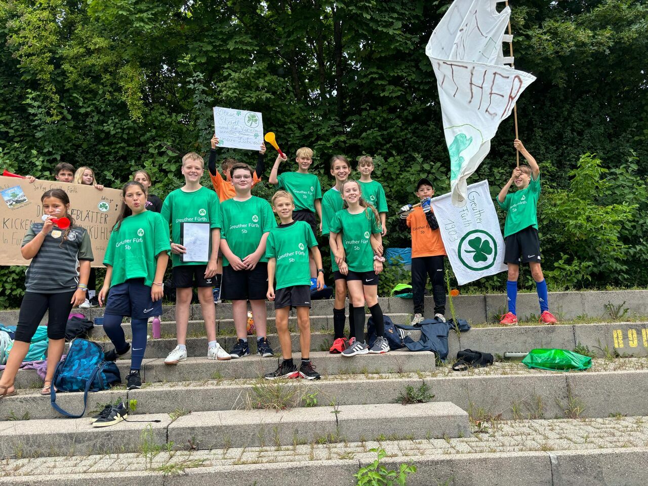 Herzlichen Glückwunsch an die Sieger*innen der Unterstufe (Klasse 6b als HSV), an die Gewinner*innen der Mittelstufe (Klasse 8b als Dresden) und an die K1-Gruppe (Mönchengladbach). Der Fanpreis ging an die Mannschaft Greuther Fürth (Klasse 5b), die lautstark mit Deko und Fansprüchen ihre Mannschaft anfeuerte und als Fangruppe unter allen anderen herausstach.