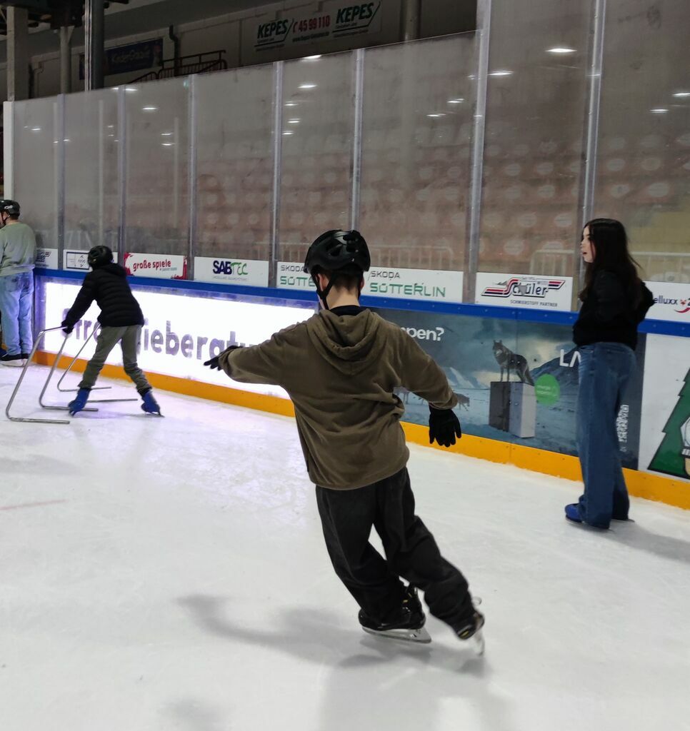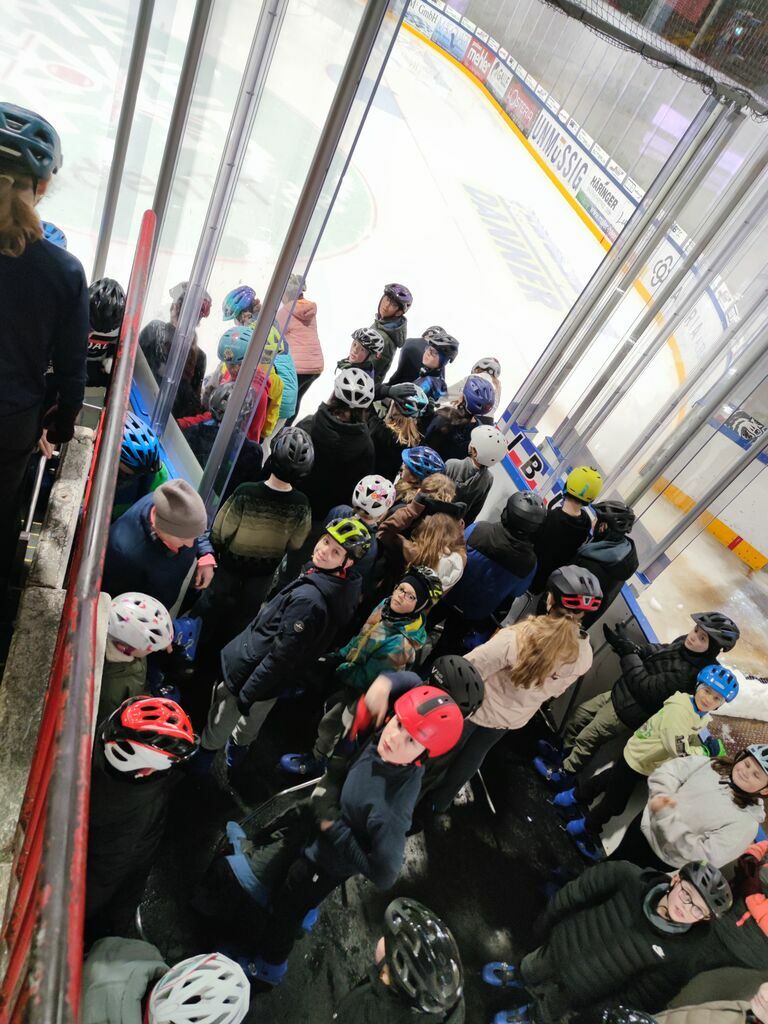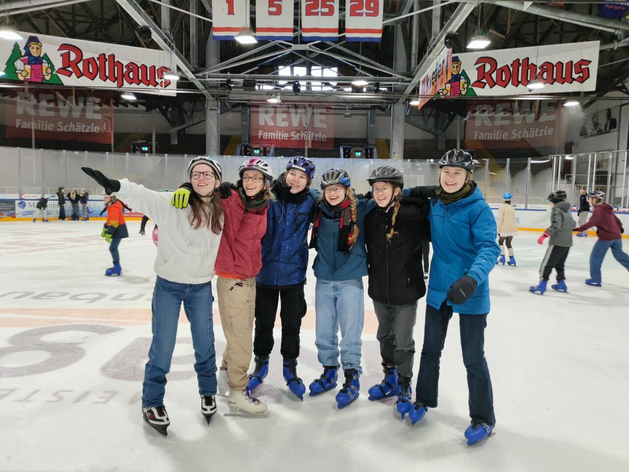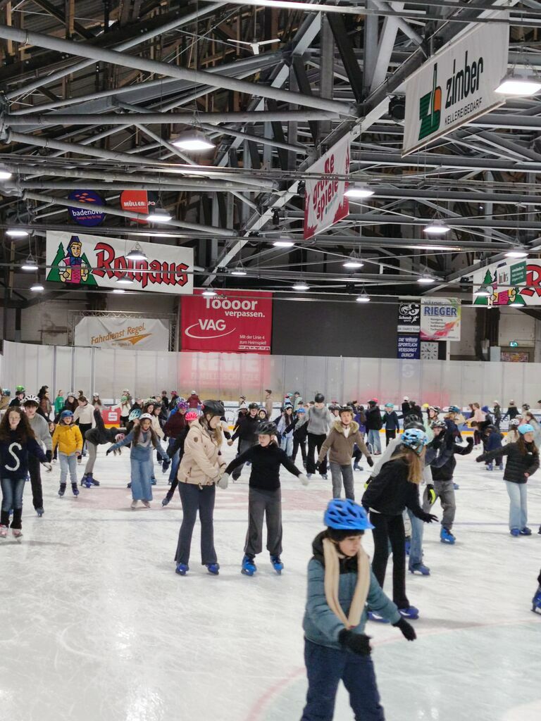 Nicht ganz so kalt, aber immer noch cool war es in der Freiburger Eishalle, wo sich Schüler*innen von Klasse 5 bis K2 aufs Eis wagten und sehr viel Spaß zusammen hatten.